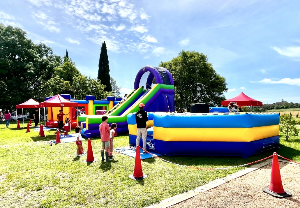 El precio incluye el alquiler del juego hinchable, el motor inflador, el transporte hasta 80 km de Platja d’aro (el costo del km complementario es de 1,2€), el montaje y desmontaje, un monitor especializado para la supervisión y correcto funcionamineto y el seguro de responsabilidad civil obligatorio.