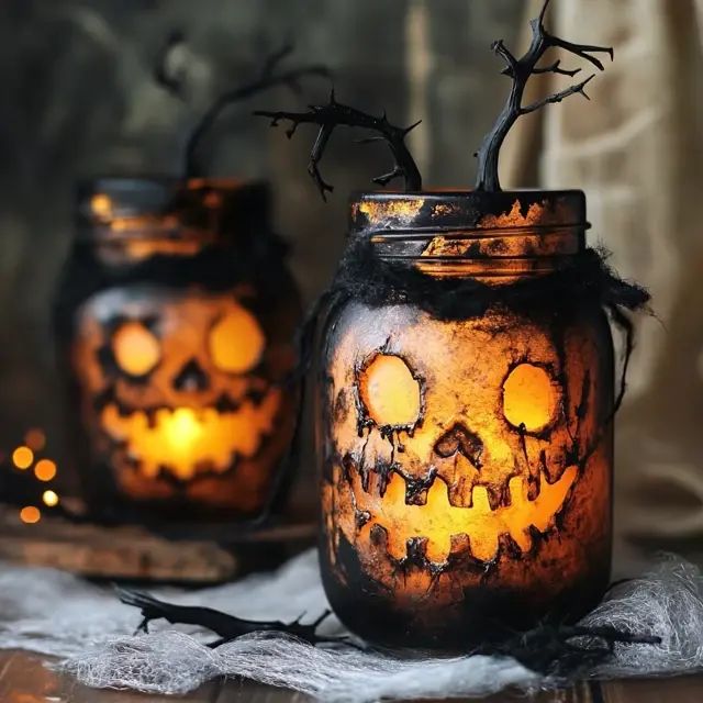 Pinta caras de fantasmas, calabazas o monstruos espeluznantes en los frascos y coloca luces LED en su interior. Cuando enciendas las luces en un lugar oscuro, crearás un ambiente misterioso que hará que tus invitados sientan que están en una casa encantada. Puedes colocarlos en la entrada, en una mesa de dulces o colgarlos con una cuerda resistente.