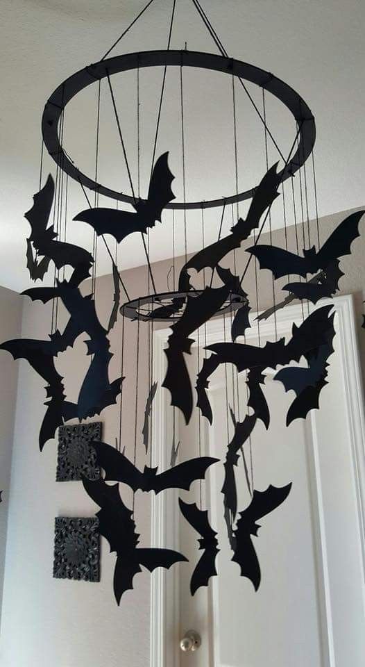Los murciélagos son un clásico de Halloween que no falla. Recorta siluetas de murciélagos en distintos tamaños sobre la cartulina negra. Con un rotulador blanco dibuja las alas y los ojos para darles un toque más real. Luego, pégalos a una cuerda o hilo y cuelgalos en la pared o atarlo de extremo a extremo en una habitación. Si queréis darle un toque más terrorífico podéis colocar un ventilador cerca para que se muevan suavemente.